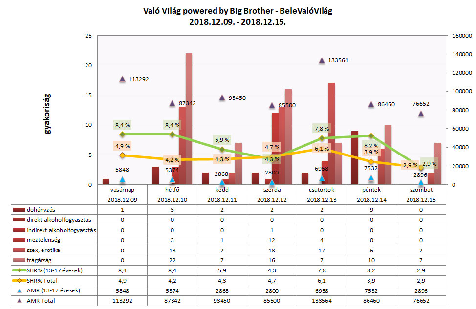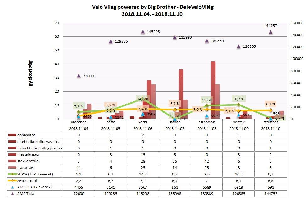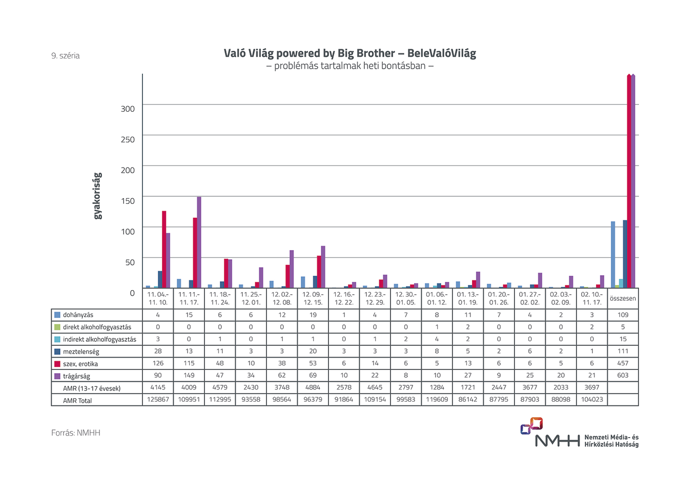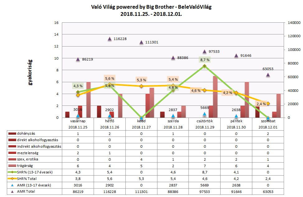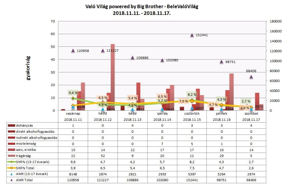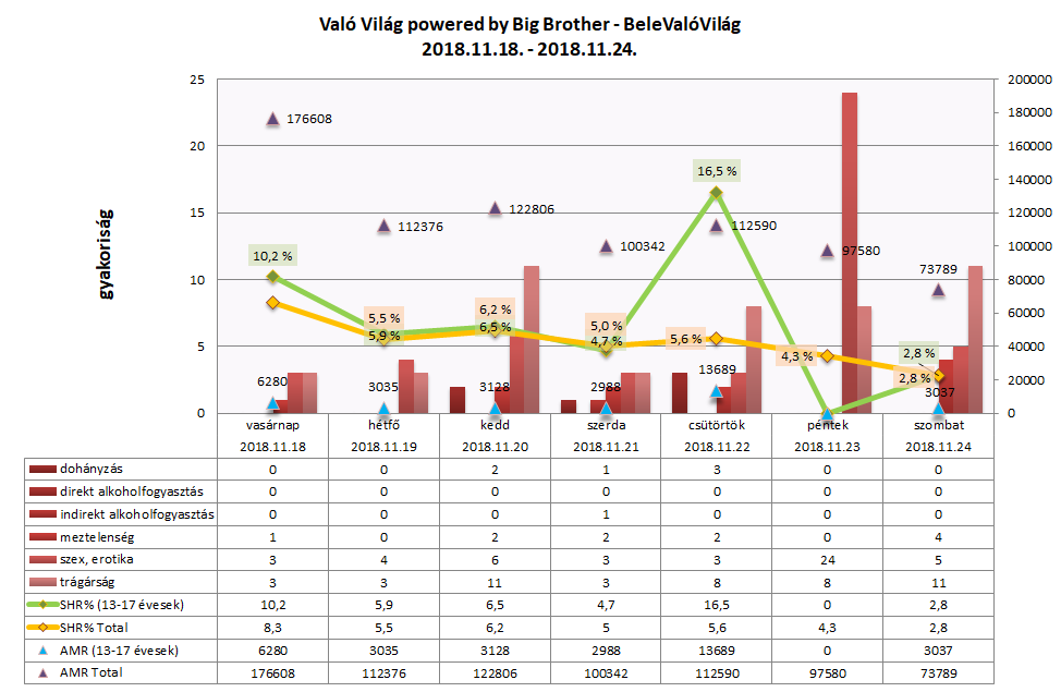Az RTL II csatornán 2018. november 4-én elindult a Való Világ kilencedik – legfrissebb – szériája. A televíziós valóságshow-kat övező érdeklődésre tekintettel a korábbi évadokhoz hasonlóan a Nemzeti Média- és Hírközlési Hatóság idén is heti rendszerességgel vizsgálja a Való Világ powered by Big Brother c. program 22 óra utáni kiadásait, illetve a délutáni ismétléseit, valamint figyelemmel kíséri a BeleValóVilág powered by Big Brother c. éjjeli kísérőműsorban megjelenő tartalmakat. Ezzel párhuzamosan, a korábbi gyakorlatnak megfelelően, a megszokott „barométer” módszertana szerint zajlik az aggályos tartalmak (szexualitás, szexuális kontextusban megjelenő meztelenség, trágár kifejezések, dohányzás, alkoholfogyasztás) megfigyelése, amelynek eredményeit heti periodicitással dolgozza fel és publikálja.
