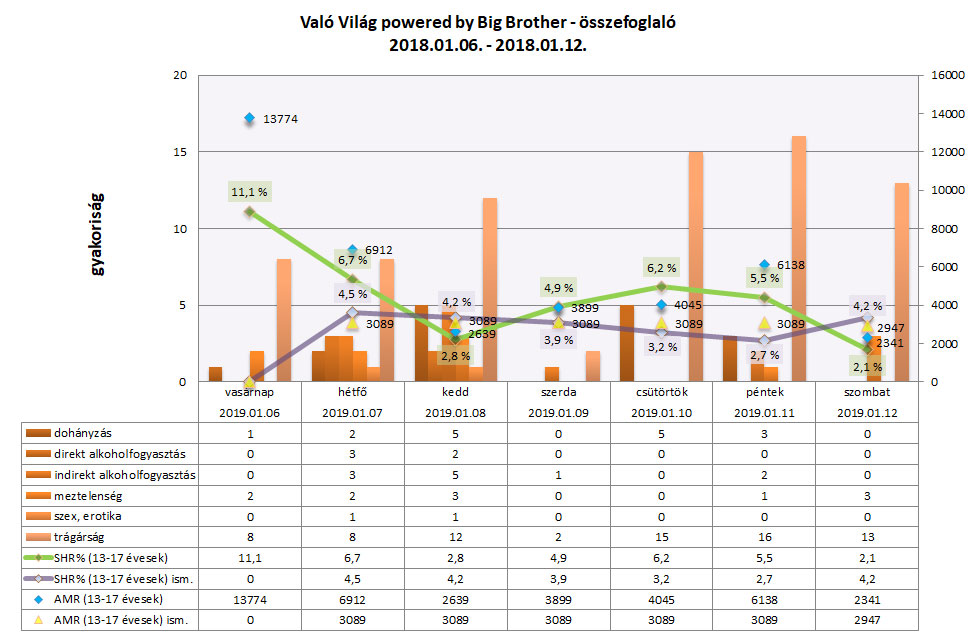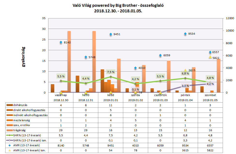 Az előző szériák tapasztalataiból kiindulva a szexualitás, a szexuális kontextusban megjelenő meztelenség, a trágár kifejezések gyakorisága, valamint negatív magatartásmintaként a dohányzás és az alkoholfogyasztás bemutatása mentén tanulmányozza az adásokat. A vizsgálatban használt elemzési egység a káros viselkedésmintákat közvetítő jelenet (két vágás között, azonos térben és időben zajló történések megszakítás nélküli sorozata). A jeleneteket annyiszor regisztrálja, ahány alkalommal azokat a műsorszerkesztő az összefoglalóban megjeleníti. A problémás tartalmak közül egyedül a trágársággal kapcsolatban alkalmaz eltérő módszertant, mivel a durva, trágár kifejezések gyakorisága könnyen számszerűsíthető. Ebben az esetben nem a jelenetek, hanem a szavak előfordulása képezi az elemzési egységet.