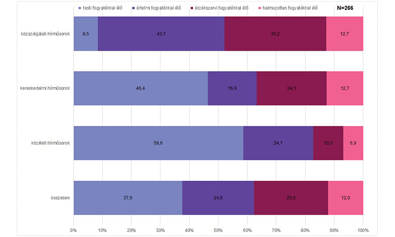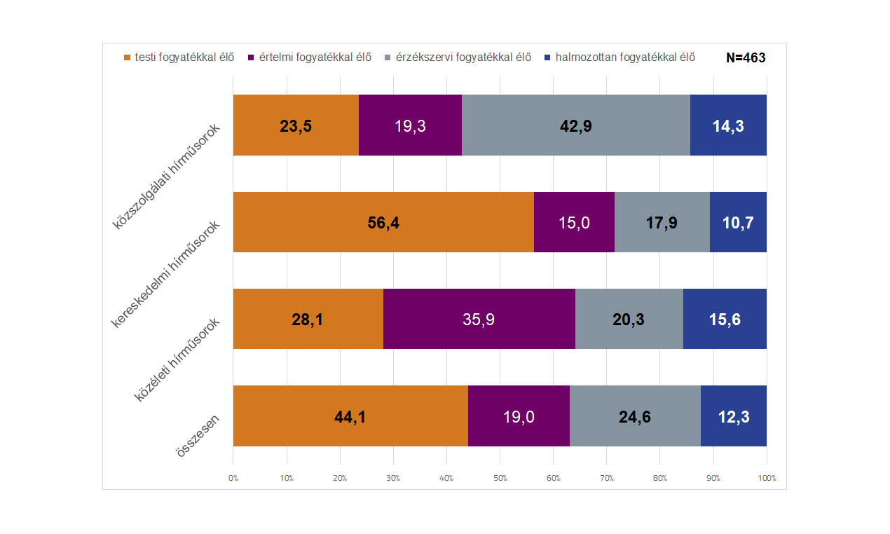 A fogyatékkal élő szereplők megjelenése elenyésző, összességében 0,3 százalék volt a híradókban, azaz továbbra is gyakorlatilag „láthatatlanok” a médiafogyasztók számára. Leggyakrabban (0,5%) a kereskedelmi híradásokban szerepeltek.